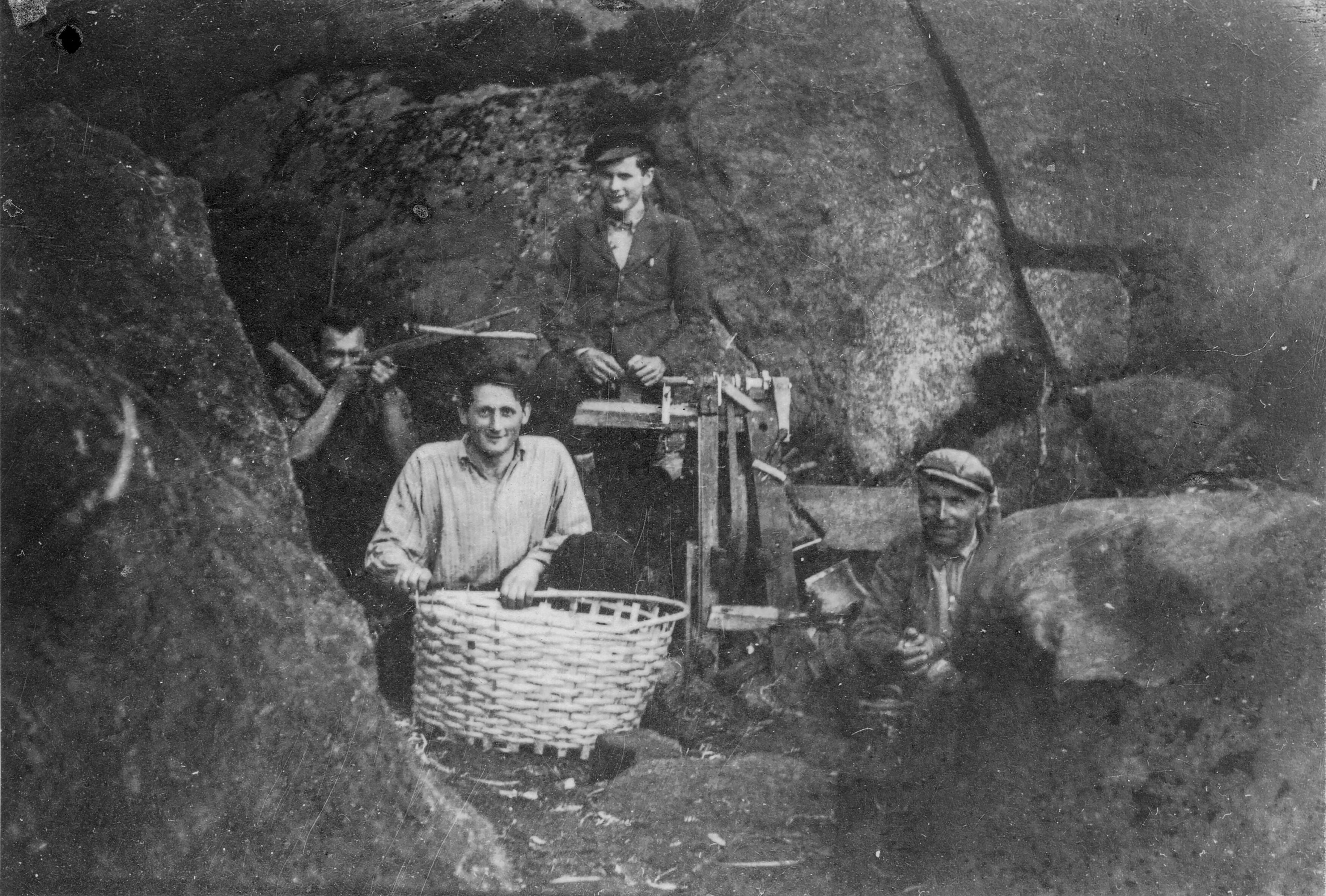 Bildet øverst: Utenfor Hålo – vi ser fra venstre ser vi Gudmund, Bernt, John og Johan. John står med dreiebenken han laget.