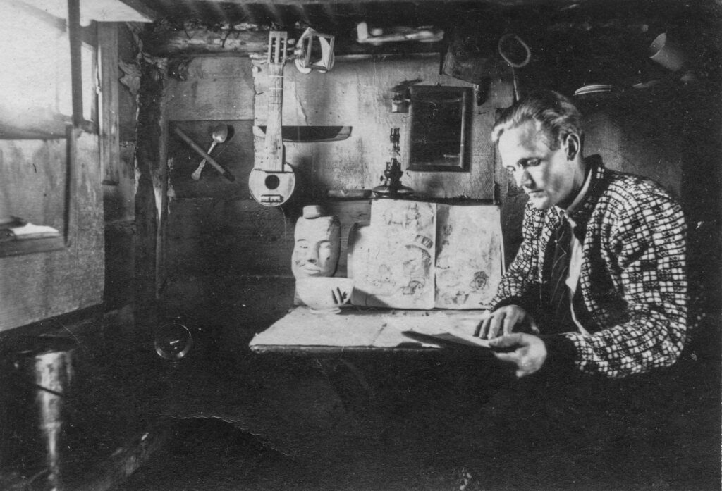 Bildet underst: Inne i Hålo. På veggen henger en gitar/banjo John også laget.