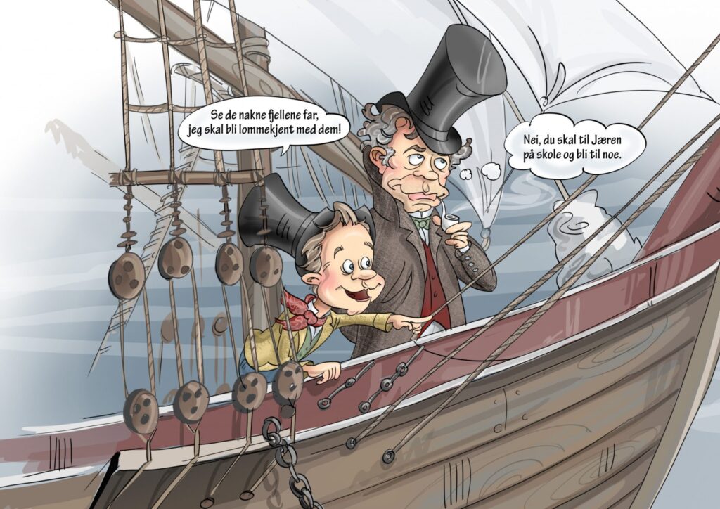 Tegningen av Johan Feyer og faren viser dem om bord i et dampskip. De reiste nemlig sjøveien til Egersund. Skipet de reiste med het D/S Constitutionen.