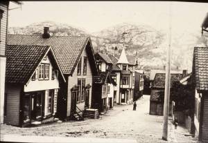 Johan Feyers gate i 1890-åra med Danckes bokhandel og Bedehuset på venstre side.Foto: P. A. Flak/DF