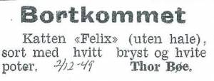 Da Dalane Tidendes redaktør Halvdan Slettebøe i spalten Okka by tenkte høyt over hva som var spesielt ved Egersund framhevet han den haleløse katten. Så det snurrige Egersund i Eigersund har mye rart: den eneste stammen haleløse katter og de ene Chinaclayblomstene.1)