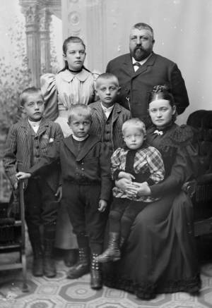 Familien Hiorth cirka 1894. Bakerst f.v: Sofie Fredrikke Hauge Hiorth, Jacob Fredrik de Rytter Hiorth. I midten: Jacob de Rytter Hiorth. Foran f.v.: Anders Sevaldsen Hiorth, Thoralf Maria Schlutter Hiorth, Theodor Lauritz Hauge Hiorth og Karen Sevaldsen Hiorth. Foto: E. H. Torjusen