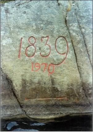 Ved Bruvik, på det nærmest loddrette berget innenfor flua Flyndrehovet, er årstallet 1839 hugget inn med 34 cm høye tall. 64 cm under tallene er det hugget inn en 64 cm lang vannrett linje. 38 cm under denne igjen er det hugget inn en tilsvarende linje. De to vannrette linjene utgjør et middelvannsmerke, hugget inn i berget i 1839. Den øverste linja, høyvannslinja, ble hugget inn 10. juni, mens den nederste, lavvannslinja, ble hugget inn 20. juni.