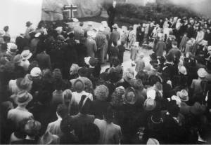 Mye folk var møtt fram ved avdukingen av minnesmerket over Edvin Lundevold Aakre. Foto: Ukjent/Dalane Folkemuseum.