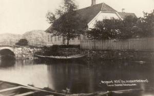 Nesgård mellom 1854 og 1878. Kirkeviken i forgrunnen. I fotoet står teksten «Nesgaard 1850», men dette må være tatt etter 1854 da det er den ombyggede Nesgård vi ser i fotoet. Foto: Dalane Folkemuseum.