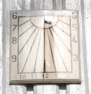 Soluret på kirkens sørvegg når sola står i sør (på fototidspunktet kl. 13:20 - viseren er en tanke bøyd). Foto: Per Einar Lædre